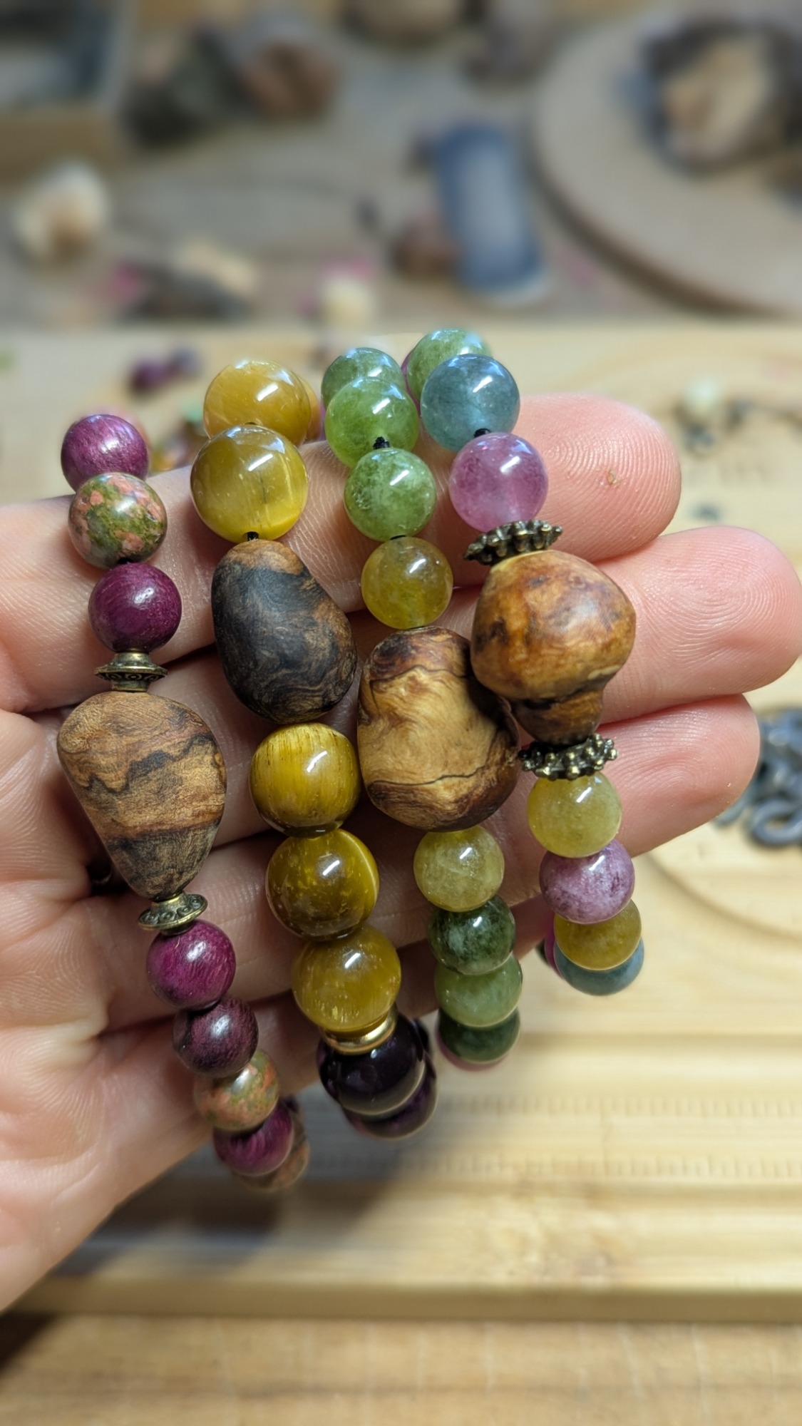 Meine Schmuckstücke verbinden natürliche Materialien mit feiner Gestaltung. Baumperlen, Edelsteine und ausgewählte Hölzer werden behutsam verarbeitet, sodass kleine Begleiter entstehen, die Wärme und Natürlichkeit ausstrahlen. Sie sind für Menschen gedacht, die das Echte lieben und Details schätzen.
